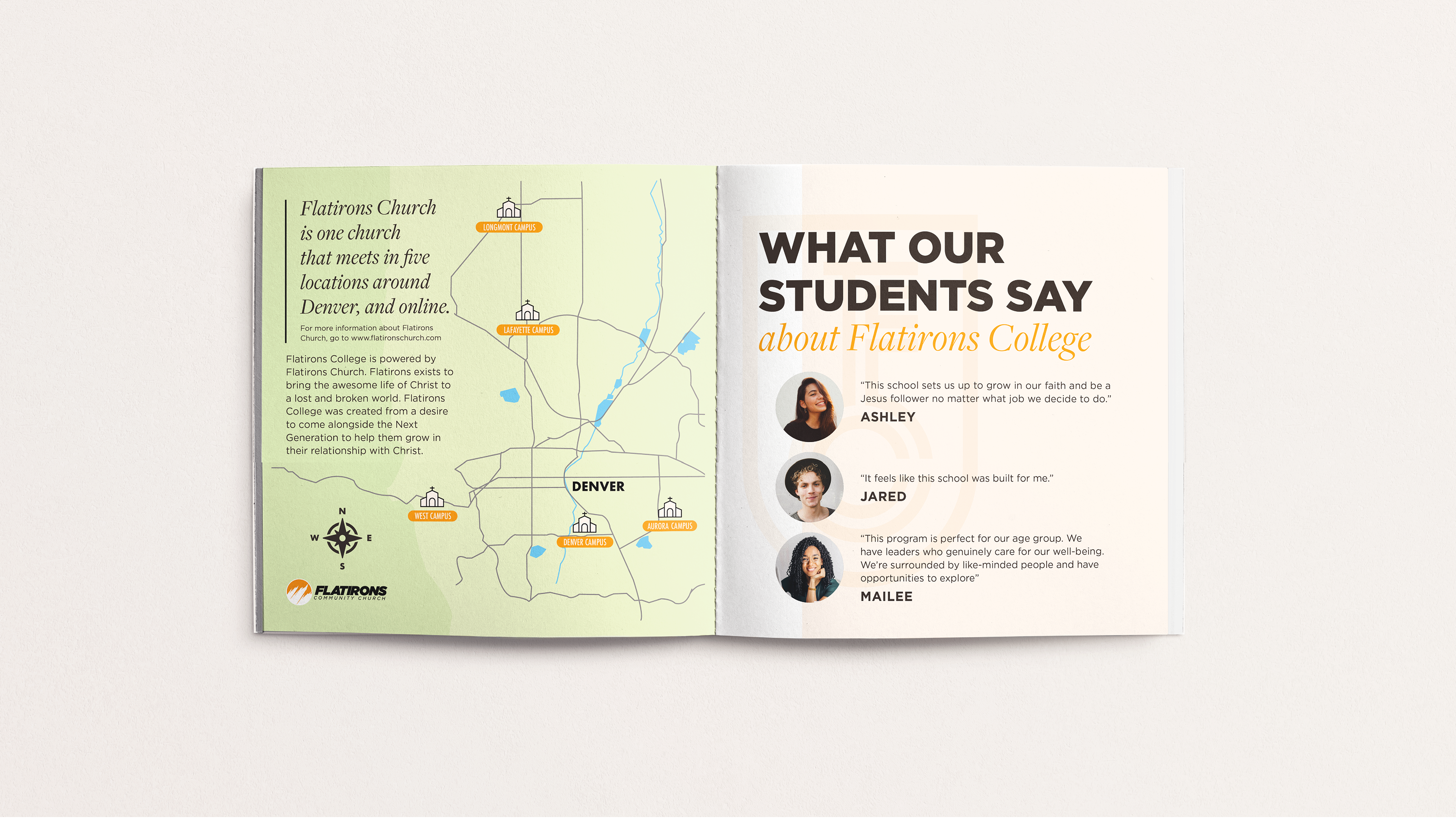 Book cover & interior layout design for Flatirons College. Style objectives include turning an information-heavy document into a clear, brand-consistent handbook inviting students to consider getting an education from Flatirons College.